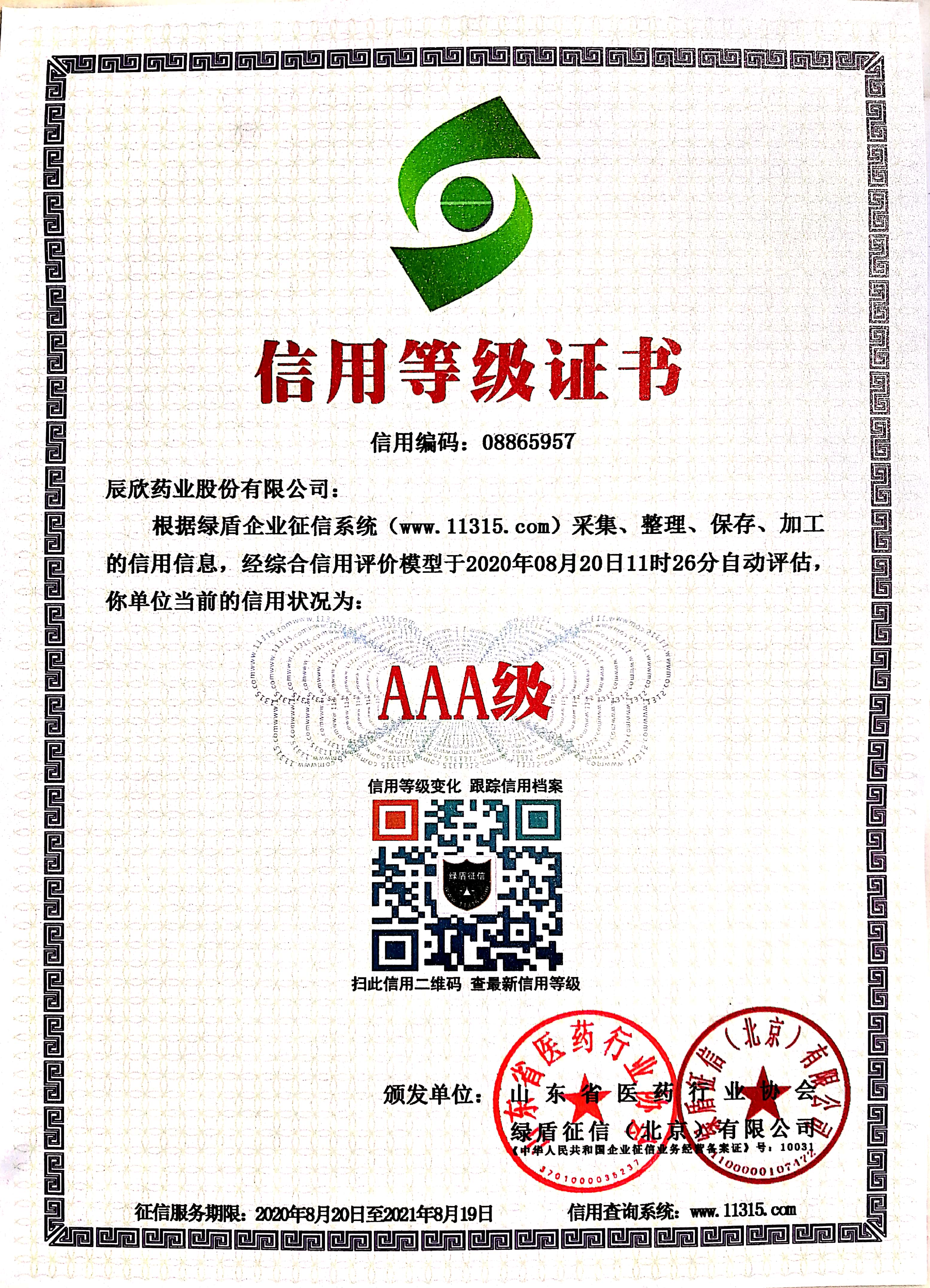 此次活動由山東省醫藥行業協會組織,旨在通過信用體系評定,規范行業秩序,加強全省醫藥行業信用體系建設,促進全省醫藥產業健康發展。此次信用評級工作依托第三方征信機構綠盾征信(北京)有限公司的企業征信系統數據,以及專家評審委員會評審意見,保證評級科學、真實、合理,最終確定受評企業的信用等級。